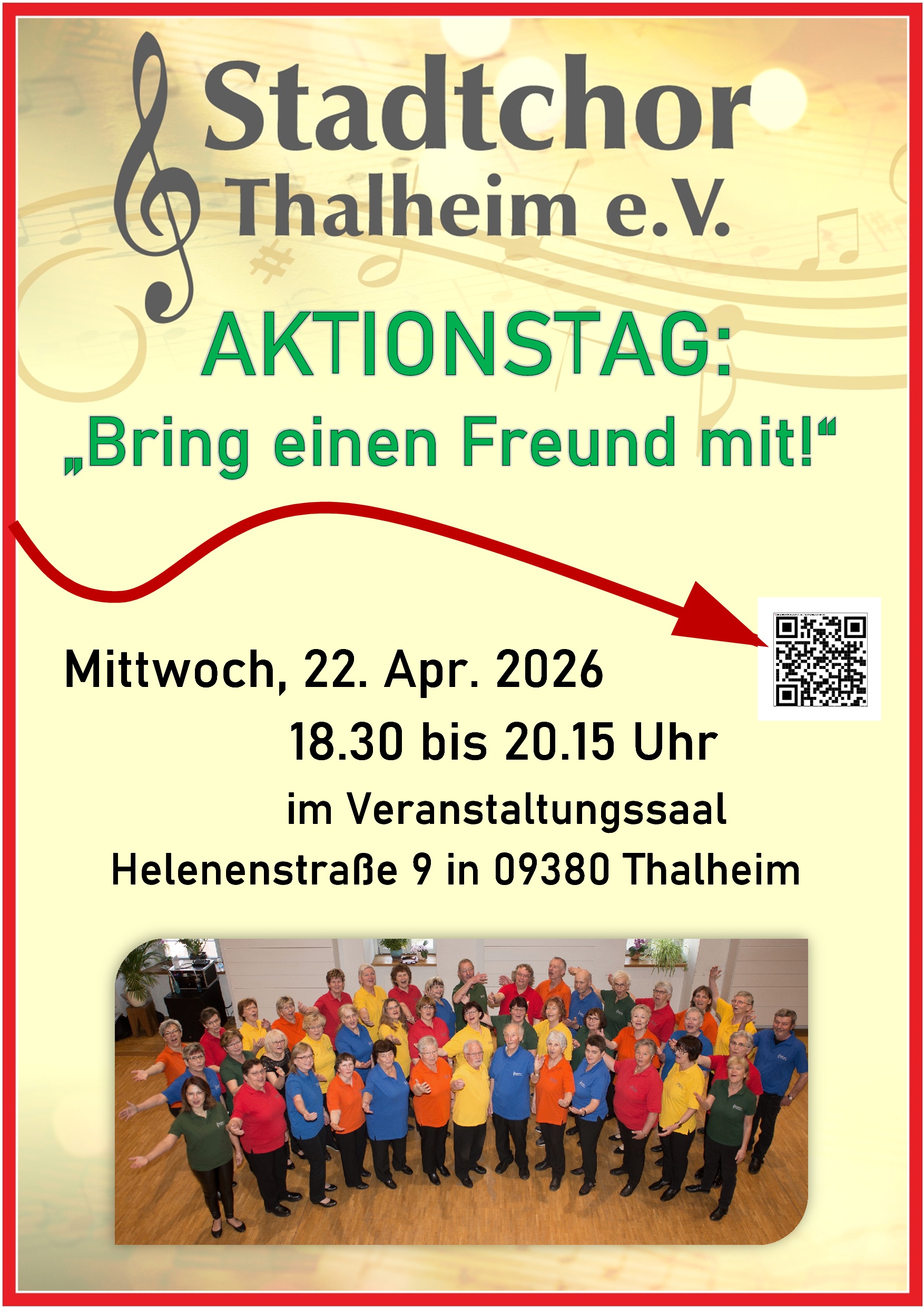 jeder Chorist soll einen Freund mitbringen - jeder Freund kann einfach vorbeischauen, uns zuhören, mit uns singen und lachen und Spaß haben... Komm!